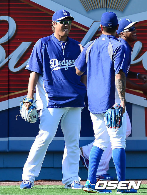 4일 오전(이하 한국시간) 미국 캘리포니아주 로스앤젤레스 다저스타디움에서 열리는 LA 다저스와 샌디에이고 파드리스의 경기 시작 전 류현진이 동료들과 장난을 치고 있다.