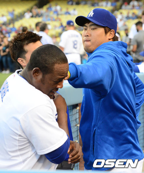 4일 오전(이하 한국시간) 미국 캘리포니아주 로스앤젤레스 다저스타디움에서 열린 LA 다저스와 샌디에이고 파드리스의 경기 시작 전 류현진과 우리베가 장난을 치고 있다.
