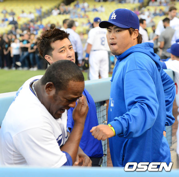 4일 오전(이하 한국시간) 미국 캘리포니아주 로스앤젤레스 다저스타디움에서 열린 LA 다저스와 샌디에이고 파드리스의 경기 시작 전 류현진과 우리베가 장난을 치고 있다.