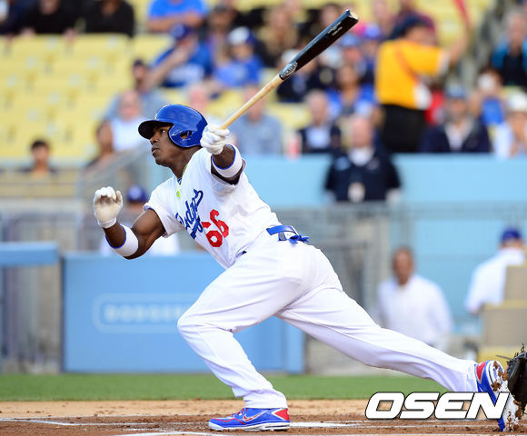 4일 오전(이하 한국시간) 미국 캘리포니아주 로스앤젤레스 다저스타디움에서 열린 LA 다저스와 샌디에이고 파드리스의 경기 1회말 선두타자 푸이그가 중전안타를 치고 있다.