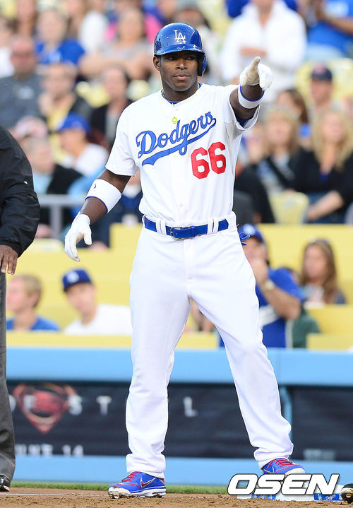 4일 오전(이하 한국시간) 미국 캘리포니아주 로스앤젤레스 다저스타디움에서 열린 LA 다저스와 샌디에이고 파드리스의 경기 1회말 선두타자 푸이그가 안타를 치고 1루베이스에 서 있다.