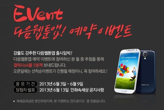 다음 웹툰 앱을 누구보다 빨리 만나고 싶은 이용자는 휴대폰 번호를 입력해 이벤트에 참여하면 된다. 다음은 사전 예약 이벤트 참여자 중 추첨을 통해 5명에게 갤럭시S4를 증정한다. 앱 출시 후 대규모 선착순 다운로드 이벤트가 진행될 예정이라 사전 예약을 하면 당첨 확률을 높일 수 있다.