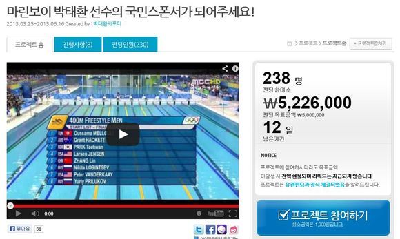 힐링캠프 방송 이후 크라우드펀딩회사인 유캔펀딩에서 진행중인 '마린보이 박태환 선수의 국민스폰서가 되어주세요!’'프로젝트가 누리꾼에게 다시금 주목을 받고 있다.