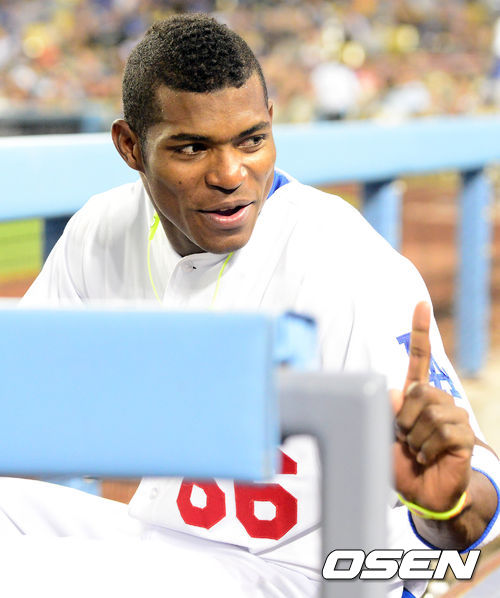 4일 오전(이하 한국시간) 미국 캘리포니아주 로스앤젤레스 다저스타디움에서 열린 LA 다저스와 샌디에이고 파드리스의 경기 8회초 푸이그가 덕아웃에서 동료들과 이야기를 나누고 있다.