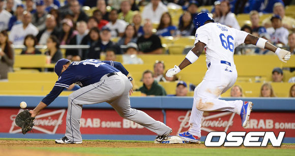 4일 오전(이하 한국시간) 미국 캘리포니아주 로스앤젤레스 다저스타디움에서 열린 LA 다저스와 샌디에이고 파드리스의 경기 8회말 1사 2루 푸이그가 내야땅볼에 1루에서 세이프되고 있다.