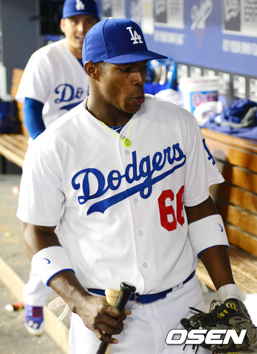 4일 오전(이하 한국시간) 미국 캘리포니아주 로스앤젤레스 다저스타디움에서 열린 LA 다저스와 샌디에이고 파드리스의 경기 종료 후 푸이그가 덕아웃에서 장비를 챙기고 있다.
