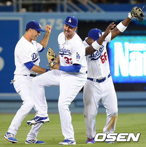 4일 오전(이하 한국시간) 미국 캘리포니아주 로스앤젤레스 다저스타디움에서 열린 LA 다저스와 샌디에이고 파드리스의 경기 종료 후 이디어, 밴슬라이크, 푸이그가 세리모니를 하고 있다.