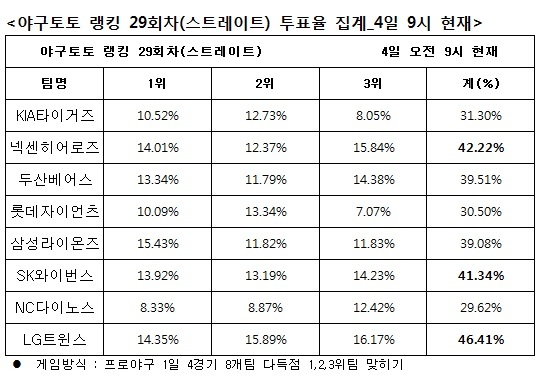 국민체육진흥공단(www.kspo.or.kr)이 발행하는 체육진흥투표권 수탁사업자인 스포츠토토 공식발매사이트인 베트맨(www.betman.co.kr)은 5일에 개최되는 LG-두산, 넥센-삼성, 롯데-KIA, NC-SK 등 4경기 8개팀을 대상으로 한 야구토토 랭킹 29회차 스트레이트 게임 중간집계결과 LG(46.41%), 넥센(42.22%), SK(41.34%)을 차례로 다득점 상위 3개팀으로 꼽았다고 밝혔다. 반면 롯데(30.50%), NC(33.96%)는 가장 적은 득점을 기록할 것으로 예상했다.