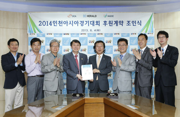2014 인천아시안게임조직위원회(위원장 김영수) 권경상 사무총장과 이영만 ㈜헤럴드 대표이사는 4일 오후 조직위원회 16층 영상회의실에서 서플라이어(Supplier)급 공식 후원계약을 체결했다.