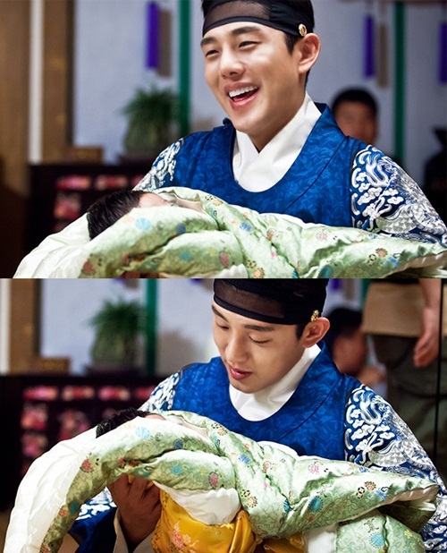 공개된 사진에는 아직 분장을 채 마치지도 않은 상태에서 강보에 쌓인 극중 아들을 안고 있는 유아인의 모습이 담겨 있다. 유아인은 아기를 신기하게 쳐다보는가 하면 함박웃음을 지으며 훈훈한 아빠의 모습을 하고 있다.