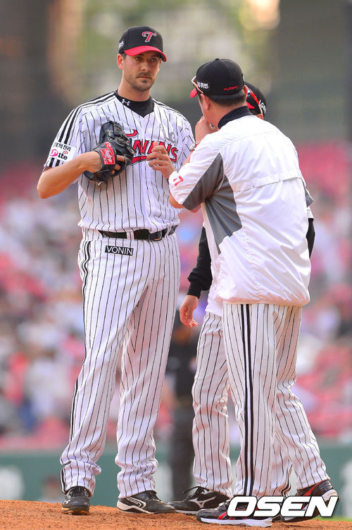 4일 오후 서울 잠실구장서 열린 '2013 한국야쿠르트 세븐 프로야구' LG 트윈스와 두산 베어스의 경기 1회초 1사 만루 위기에서 LG 차명석 투수코치가 마운드에 올라와 선발투수 주키치와 이야기를 나누고 있다