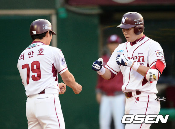 4일 오후 목동 야구장에서 열린 '2013 한국야쿠르트 세븐 프로야구' 넥센 히어로스와 삼성 라이온즈 경기,2회말 1사 강정호 솔로홈런을 날리고 홈인 최만호코치의 환영을 받고 있다.