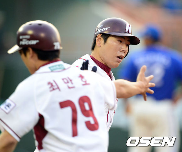 4일 오후 목동 야구장에서 열린 '2013 한국야쿠르트 세븐 프로야구' 넥센 히어로스와 삼성 라이온즈 경기,2회말 1사 강정호 솔로홈런을 날리고 최만호 코치의 환영을 받으며 그라운드를 돌고 있다.