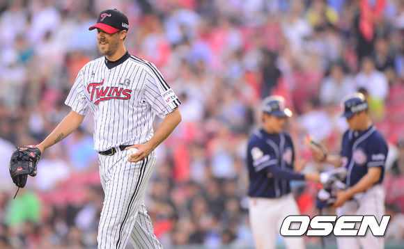 4일 오후 서울 잠실구장서 열린 '2013 한국야쿠르트 세븐 프로야구' LG 트윈스와 두산 베어스의 경기 2회초 1사 1,2루 두산 민병헌의 내야안타때 2루수의 실책으로 1실점 허용한 LG 선발투수 주키치가 실소를 짓고 있다