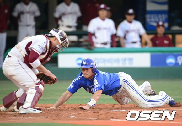 4일 오후 목동 야구장에서 열린 '2013 한국야쿠르트 세븐 프로야구' 넥센 히어로스와 삼성 라이온즈 경기,3회초 1사2루 정형식의 적시타때 2루 주자 이지영 홈까지 쇄도 동점 득점을 올리고 있다.