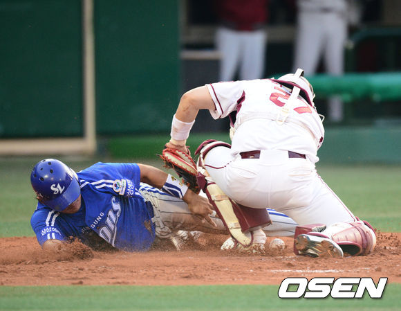 4일 오후 목동 야구장에서 열린 '2013 한국야쿠르트 세븐 프로야구' 넥센 히어로스와 삼성 라이온즈 경기,3회초 1사 2루 정형식의 적시타때 2루 주자 이지영 홈까지 쇄도 동점 득점을 올리고 있다.