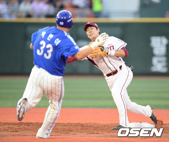 4일 오후 목동 야구장에서 열린 '2013 한국야쿠르트 세븐 프로야구' 넥센 히어로스와 삼성 라이온즈 경기,3회초 1사 1,2루 이승엽의 내야땅볼때 넥센 강정호 유격수가 1루주자 박한이를 2루에서 포스아웃 시키며 1루에 송구 병살아웃 처리시키고 있다.