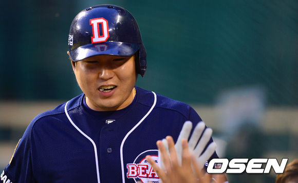 4일 오후 서울 잠실구장서 열린 '2013 한국야쿠르트 세븐 프로야구' LG 트윈스와 두산 베어스의 경기 3회초 2사 1,2루 두산 박건우의 1타점 적시타때 2루 주자 양의지가 홈을 밟은 후 동료들의 축하를 받고 있다.
