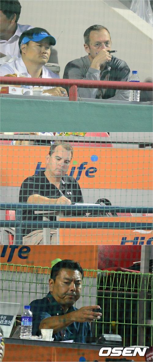 4일 오후 목동 야구장에서 열린 '2013 한국야쿠르트 세븐 프로야구' 넥센 히어로스와 삼성 라이온즈 경기,다수의 메리저리그 스카우터들이 경기를 관전하며 선수들을 체크하고 있다.