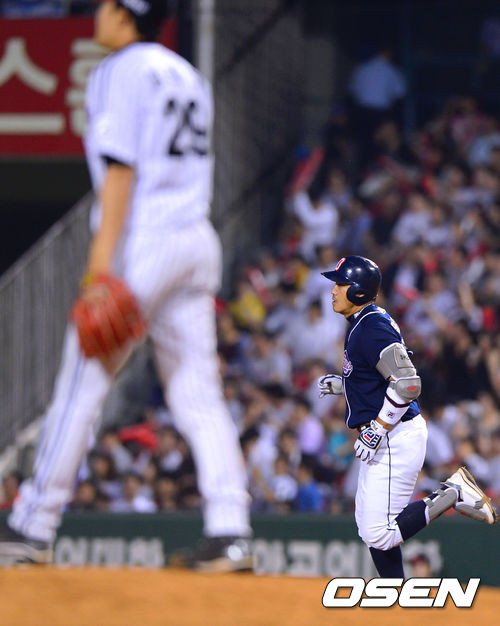 4일 오후 서울 잠실구장서 열린 '2013 한국야쿠르트 세븐 프로야구' LG 트윈스와 두산 베어스의 경기 4회초 1사 두산 선두타자 홍성흔이 솔로홈런을 날리고 베이스를 돌고 있다