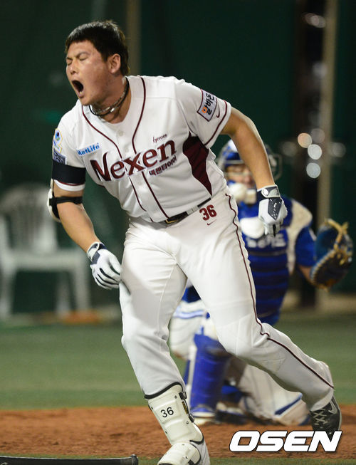 4일 오후 목동 야구장에서 열린 '2013 한국야쿠르트 세븐 프로야구' 넥센 히어로스와 삼성 라이온즈 경기,8회말 2사 이성열 삼성 심창민 투수로 부터 몸에 맞는볼을 맞고 고통스러워하고 있다.