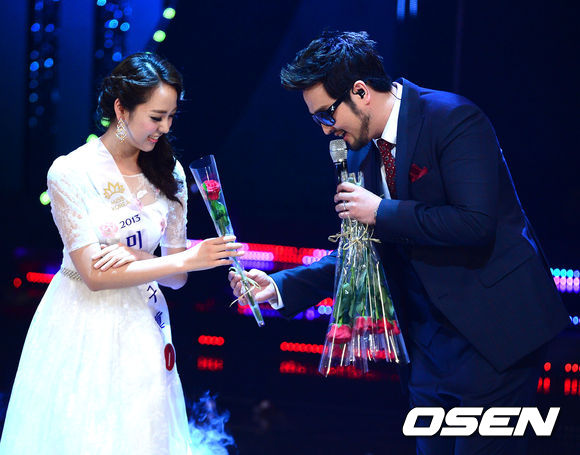 미스코리아 진 유예빈이 김태우의 축하무대에서 장미꽃을 건네 받고 있다.