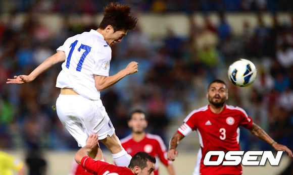 5일 새벽(한국시간) 레바논 베이루트 카밀 샤문 스포츠시티 스타디움에서 열린 2014브라질월드컵 아시아지역 최종예선 A조 6차전 한국과 레바논의 경기, 전반 이청용이 헤딩슛을 시도하고 있다