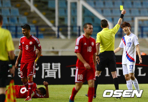 5일 새벽(한국시간) 레바논 베이루트 카밀 샤문 스포츠시티 스타디움에서 열린 2014브라질월드컵 아시아지역 최종예선 A조 6차전 한국과 레바논의 경기, 전반 이청용이 옐로우 카드를 받고 있다.