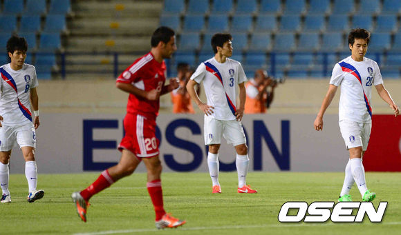 5일 새벽(한국시간) 레바논 베이루트 카밀 샤문 스포츠시티 스타디움에서 열린 2014브라질월드컵 아시아지역 최종예선 A조 6차전 한국과 레바논의 경기, 레바논 하산 마톡의 선취골때 이동국이 아쉬워하고 있다.