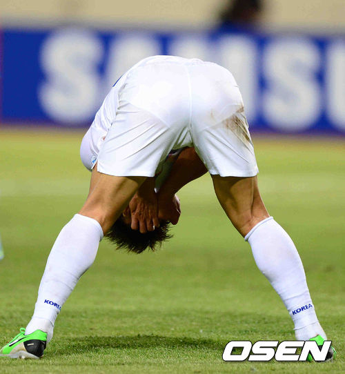 5일 새벽(한국시간) 레바논 베이루트 카밀 샤문 스포츠시티 스타디움에서 열린 2014브라질월드컵 아시아지역 최종예선 A조 6차전 한국과 레바논의 경기, 전반 이동국이 결정적인 슛 찬스를 놓친 후 아쉬워하고 있다.