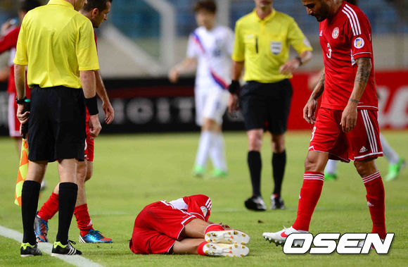 5일 새벽(한국시간) 레바논 베이루트 카밀 샤문 스포츠시티 스타디움에서 열린 2014브라질월드컵 아시아지역 최종예선 A조 6차전 한국과 레바논의 경기, 전반 레바논 수비가 쓰러져 고통스러워하고 있다.
