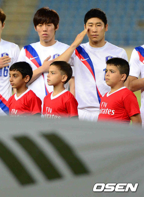 5일 새벽(한국시간) 레바논 베이루트 카밀 샤문 스포츠시티 스타디움에서 열린 2014브라질월드컵 아시아지역 최종예선 A조 6차전 한국과 레바논의 경기에 앞서 이근호가 국민의례때 거수경례를 하고 있다