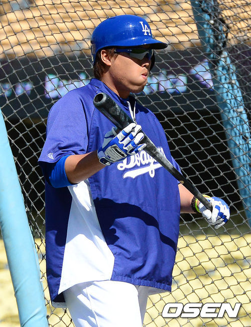 5일 오전(이하 한국시간) 미국 캘리포니아주 로스앤젤레스 다저스타디움에서 열리는 LA 다저스와 샌디에이고 파드리스의 경기 시작 전 류현진이 배팅 연습을 하고 있다.