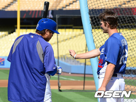 5일 오전(이하 한국시간) 미국 캘리포니아주 로스앤젤레스 다저스타디움에서 열리는 LA 다저스와 샌디에이고 파드리스의 경기 시작 전 류현진과 커쇼가 이야기를 나누고 있다.