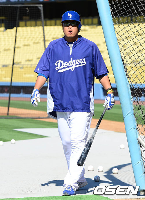 5일 오전(이하 한국시간) 미국 캘리포니아주 로스앤젤레스 다저스타디움에서 열리는 LA 다저스와 샌디에이고 파드리스의 경기 시작 전 류현진이 배팅훈련을 하고 있다.