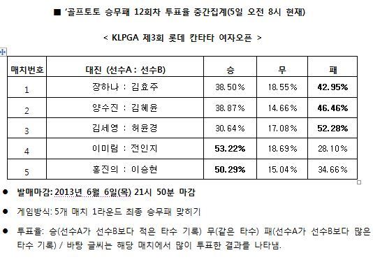 KLPGA 제3회 롯데 칸타타 여자오픈 1라운드 대상 골프토토 승무패 12회차 중간집계 결과