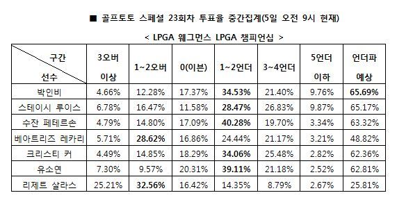 박인비에 이어 스테이시 루이스의 언더파 예상이 65.17%로 높게 예상됐고, 수잔 페테르손의 언더파 예상이 63.32%로 뒤를 이었다. 이어 유소연(62.81%), 크리스티 커(62.36%)의 언더파 예상이 뒤를 이었으며, 베아트리즈 레카리(48.82%), 리제트 살라스(25.81%)의 언더파 예상은 비교적 낮게 나타났다.