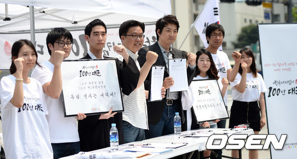 5일 오전 광화문 광장에서 진행된 한국사 수능 필수과목 선정 100만 서명운동에서 송일국, 서경덕 교수가 대한민국 홍보 동아리 '생존경쟁' 학생들과 포토타임을 갖고있다.