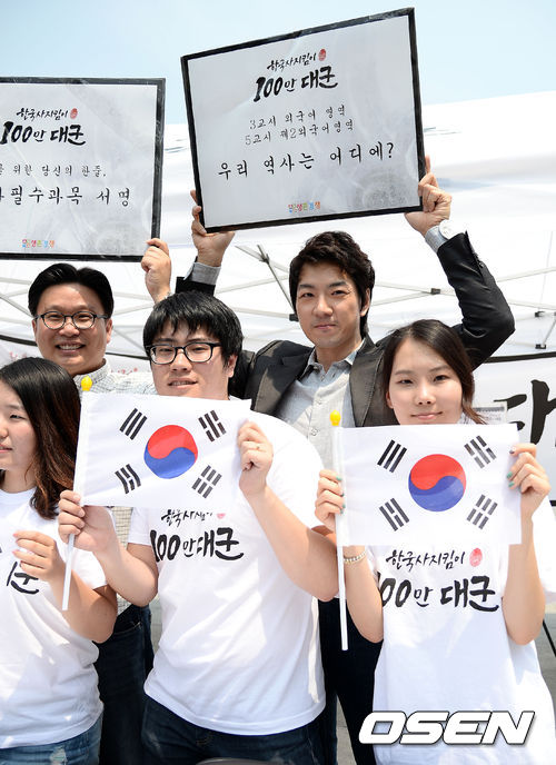 5일 오전 광화문 광장에서 진행된 한국사 수능 필수과목 선정 100만 서명운동에서 송일국, 서경덕 교수가 대한민국 홍보 동아리 '생존경쟁' 학생들과 포토타임을 갖고있다.