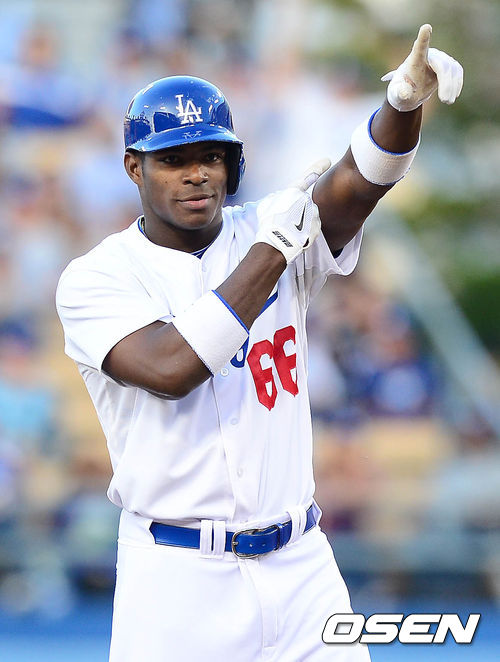 5일 오전(이하 한국시간) 미국 캘리포니아주 로스앤젤레스 다저스타디움에서 열린 LA 다저스와 샌디에이고 파드리스의 경기 1회말 선두타자 푸이그가 2루타를 치고 2루에서 세리모니를 하고 있다.
