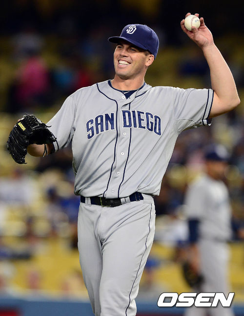 5일 오전(이하 한국시간) 미국 캘리포니아주 로스앤젤레스 다저스타디움에서 열린 LA 다저스와 샌디에이고 파드리스의 경기 4회말 선두타자 라미레즈의 직선타를 잡은 리차드가 미소를 짓고 있다.
