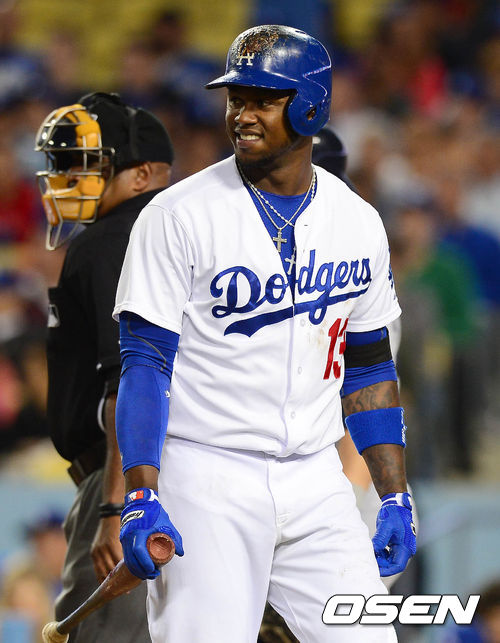 5일 오전(이하 한국시간) 미국 캘리포니아주 로스앤젤레스 다저스타디움에서 열린 LA 다저스와 샌디에이고 파드리스의 경기 4회말 선두타자 라미레스가 투수 직선타로 물러나면서 미소를 짓고 있다.