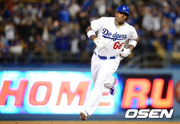 5일 오전(이하 한국시간) 미국 캘리포니아주 로스앤젤레스 다저스타디움에서 열린 LA 다저스와 샌디에이고 파드리스의 경기 5회말 1사 1,2루 푸이그가 스리런포를 친 후 베이스를 돌고 있다.