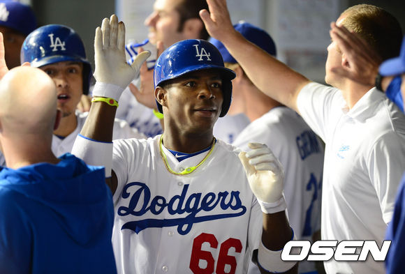 5일 오전(이하 한국시간) 미국 캘리포니아주 로스앤젤레스 다저스타디움에서 열린 LA 다저스와 샌디에이고 파드리스의 경기 5회말 1사 1,2루 푸이그가 스리런포를 친 후 덕아웃에서 동료들과 하이파이브를 하고 있다.