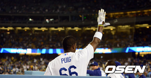 5일 오전(이하 한국시간) 미국 캘리포니아주 로스앤젤레스 다저스타디움에서 열린 LA 다저스와 샌디에이고 파드리스의 경기 5회말 1사 1,2루 푸이그가 스리런포를 친 후 덕아웃에서 관중들을 향해 손을 흔들고 있다.