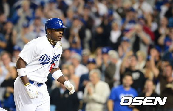 5일 오전(이하 한국시간) 미국 캘리포니아주 로스앤젤레스 다저스타디움에서 열린 LA 다저스와 샌디에이고 파드리스의 경기 6회말 2사 2루 푸이그가 투런포를 친 후 덕아웃으로 향하고 있다.