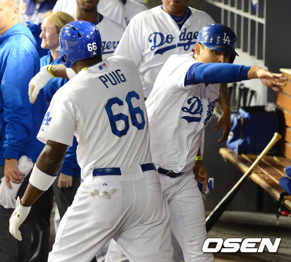 5일 오전(이하 한국시간) 미국 캘리포니아주 로스앤젤레스 다저스타디움에서 열린 LA 다저스와 샌디에이고 파드리스의 경기 6회말 2사 2루 푸이그가 투런포를 친 후 크루스와 세리모니를 하고 있다.