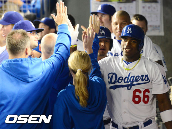 5일 오전(이하 한국시간) 미국 캘리포니아주 로스앤젤레스 다저스타디움에서 열린 LA 다저스와 샌디에이고 파드리스의 경기 6회말 2사 2루 푸이그가 투런포를 친 후 덕아웃에서 동료들과 하이파이브를 하고 있다.