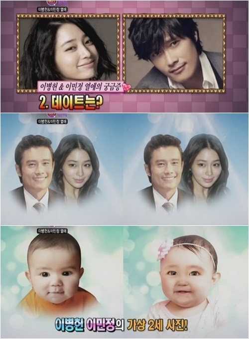 이들은 지난 해 8월 19일 각각 홈페이지를 통해 서로 교제하고 있다는 사실을 공식적으로 밝혀 화제를 모았다. 제작진은 이들의 가상 2세 모습을 만들어 내보냈고, 가상2세 사진 속 아들과 딸은 이병헌과 이민정의 좋은 유전자를 물려받은 듯 귀여운 외모를 자랑한다.