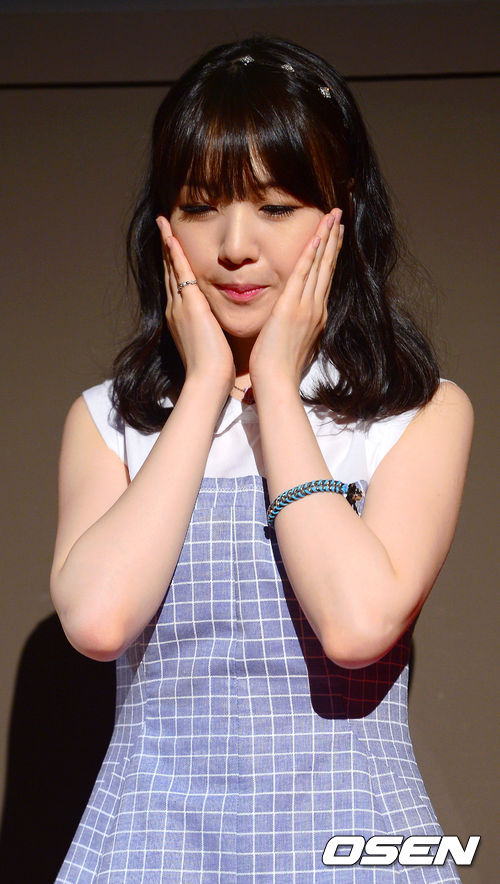 5일 오후 서울 광진구 자양동 롯데시네마 건대입구에서 진행된 영화 ‘홀리(감독 박병환)’ 언론시사회 무대인사에서 배우 민아가 볼을 만지고 있다